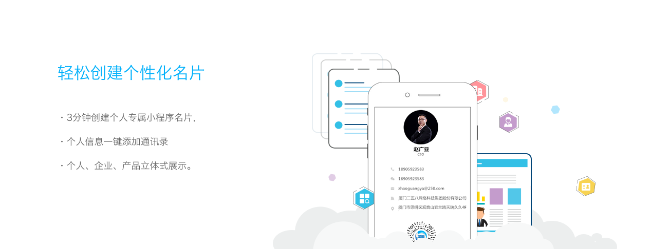 258超級名片一款懂得銷售,并且能主動進行銷售的社交名片,AI智能超級名片打通社交與銷售互通,利用數據和行為分析鎖定精_準客戶,通過微信流量開啟無限商機。AI智能超級名片=小程序名片+企業信息+產品信息+智能存儲+社交連接微信10億用戶